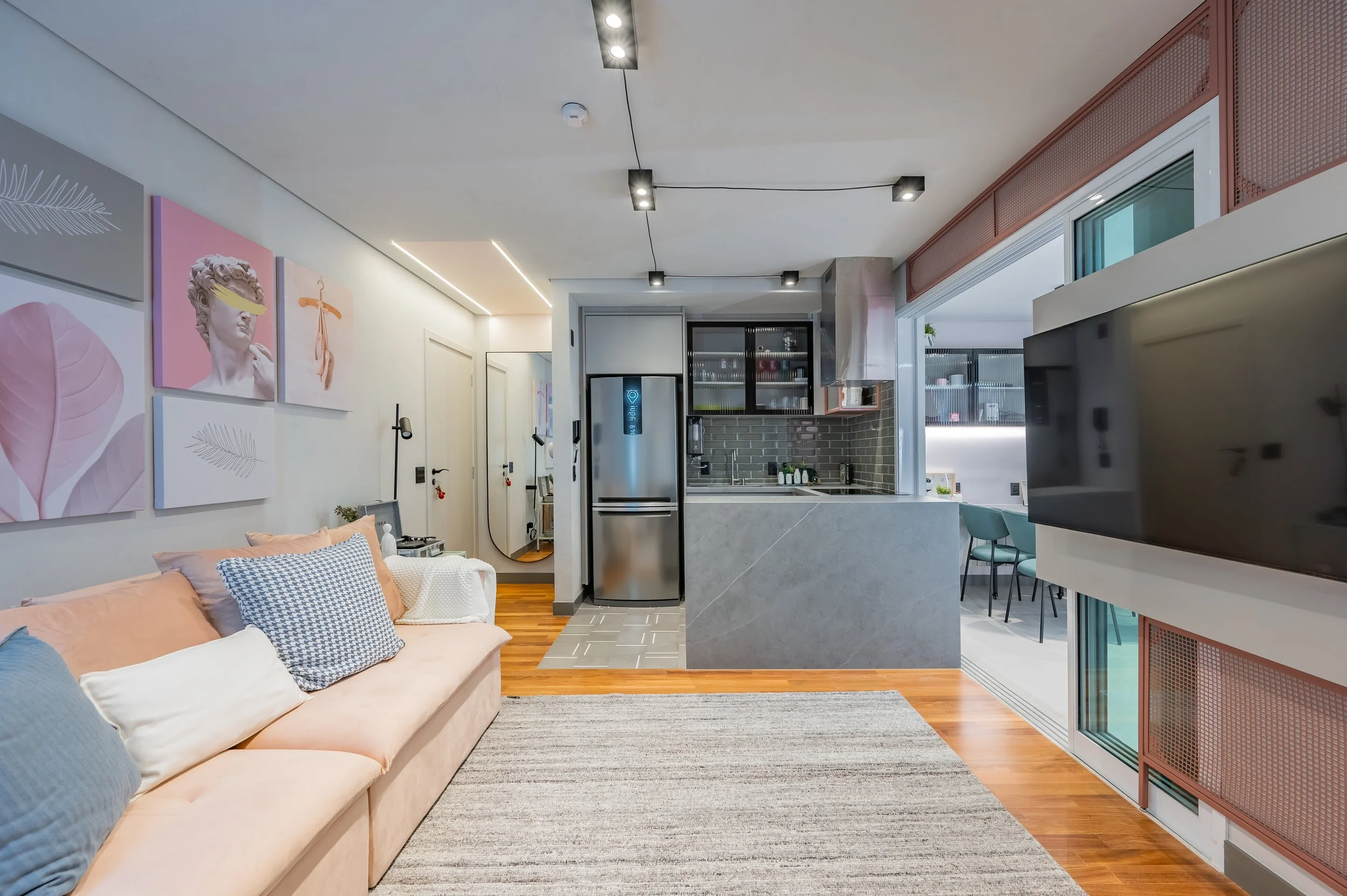Nas paredes os quadros são dispostos de forma aleatória, entre alguns deles gravuras de artistas como OS GÊMEOS. Na sala de tv o rack preenche toda a parede e no final do mesmo ele serve também para sentar-se.